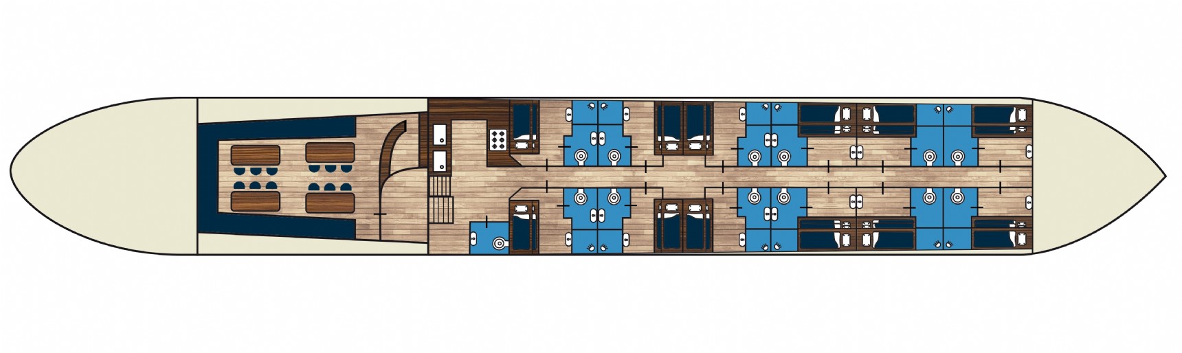 The kitchen (galley) is fully equipped with a gas stove and a large gas oven, a dishwasher and a lot of cooling and storage space for foodstuffs. Here, you can easily prepare the meals for the entire group.